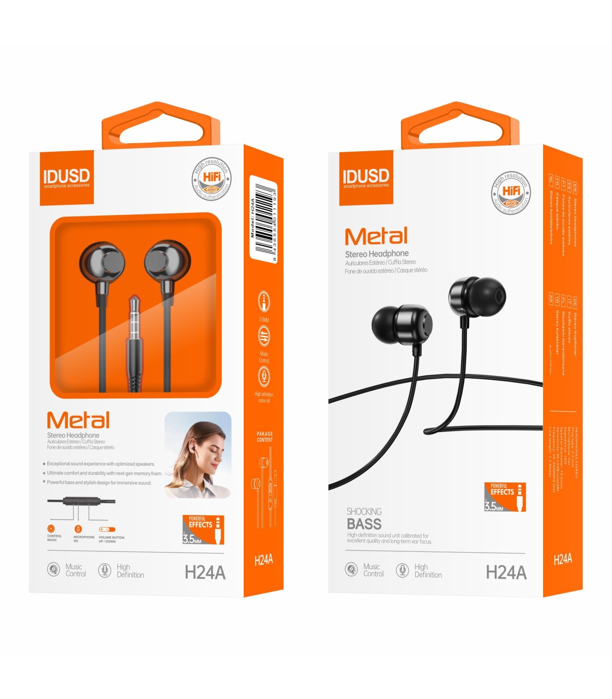 Con un acabado elegante en color negro, los Auriculares Metal 3.5mm H24A no solo destacan por su funcionalidad, sino también por su estética moderna y sofisticada. Su construcción robusta asegura una larga vida útil, convirtiéndolos en una inversión confiable para tus necesidades auditivas diarias.